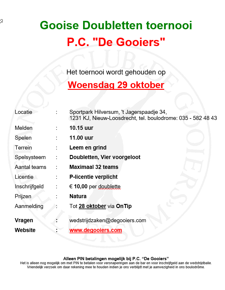 Vul het onderstaande formulier in om je in te schrijven voor het GOOISE DOUBLETTEN TOERNOOI van Petanque Club `De Gooiers` op