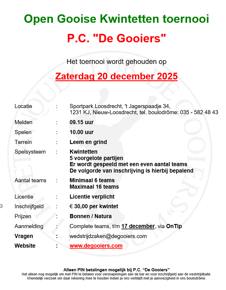Vul het onderstaande formulier in om je in te schrijven voor het OPEN GOOISE KWINTETTEN TOERNOOI van Petanque Club `De Gooiers` op